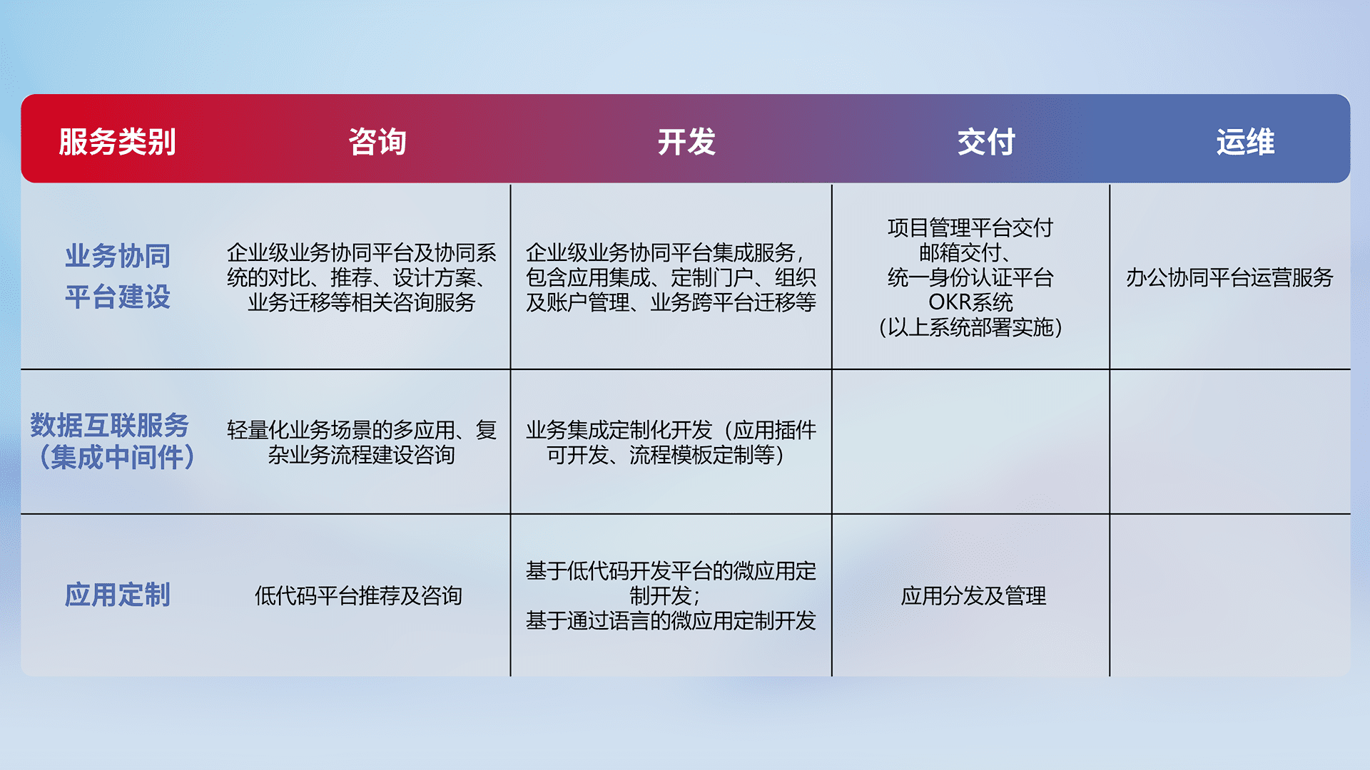 针对钉钉、、、企微、、、IDaas等平台级产品提供产品的规划、、、方案、、、交付、、定制化开发等服务,,,,实现如统一协同办公、、、智能客户服务、、混合会议管理、、智能数据查询、、等业务场景,,,,实现数字化转型。。