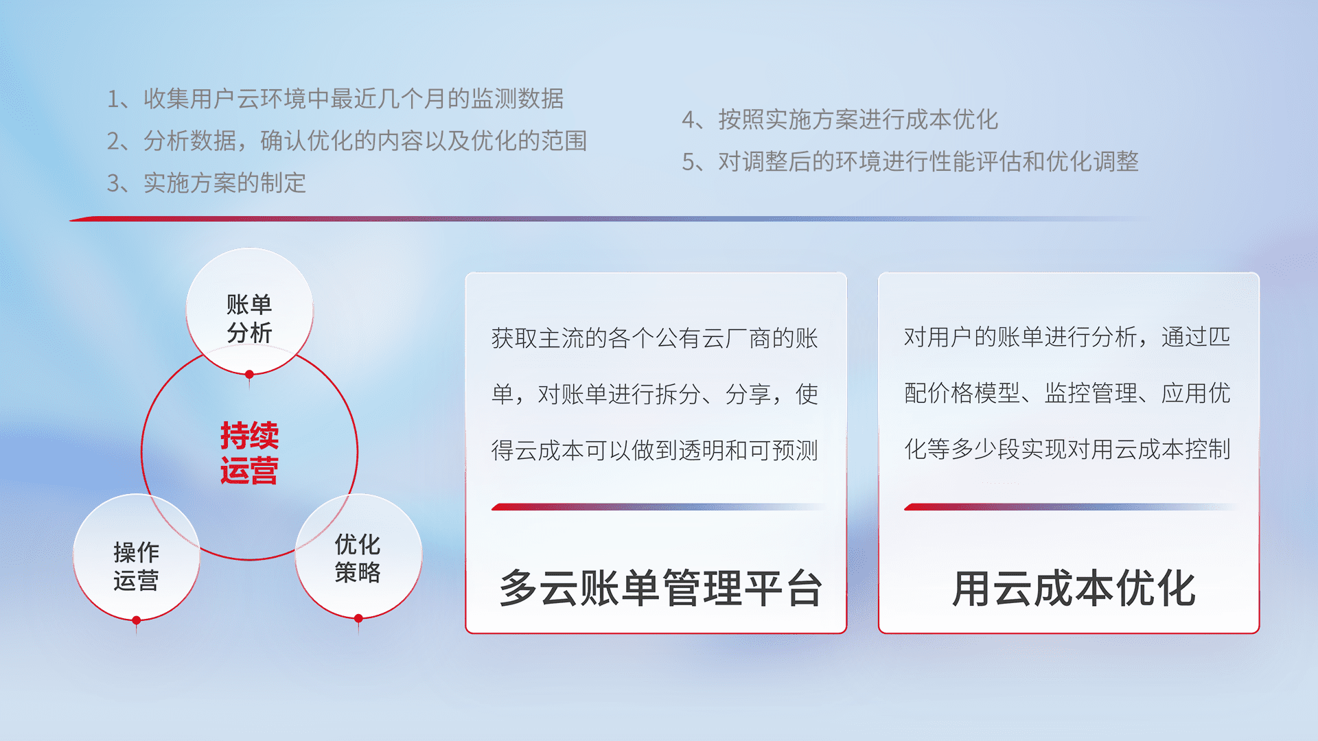 通过多云纳管,,以统一的资源数据模型把客户的云资源进行抽象和封装,,,进而实现对多云资源的统一操作,,,保障云资源管理的可靠性、、、稳定性与可用性。。。量身定制化运维内容,,配置、、、开发运维、、、、补丁管理、、、备份、、、监控、、、、认证和访问管理、、审计和日常巡检等,,,,保障在用云过程中的可靠度,,稳定度以及高可用率。。
